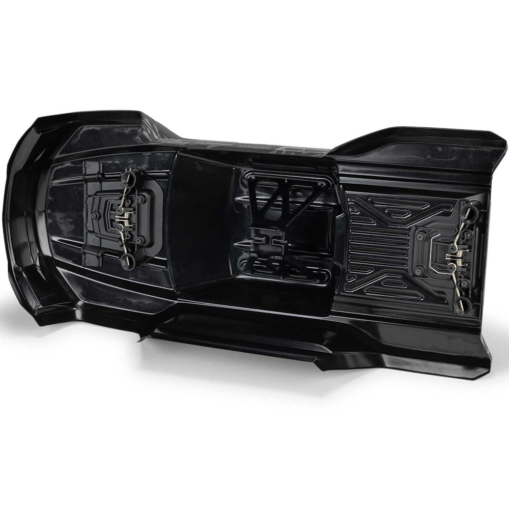 With its ominous black paint scheme and high-downforce wing, the aggressive KRATON monster truck body cuts a menacing figure off-road. But everyday maintenance is nothing to fear. It also now has a quick-release, clipless body retention system that offers fast, hassle-free chassis access and doubles as protection against body punch through.