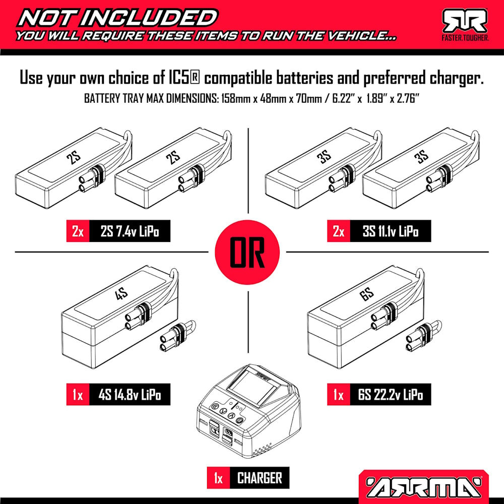 The efficient Spektrum Firma 2050Kv brushless motor is matched with an IC5 connector-equipped Spektrum Firma 150A Smart V2 ESC for more power and punch. To help you steer all that power where you want to go, ARRMA includes a muscular Spektrum S665 steel gear servo.