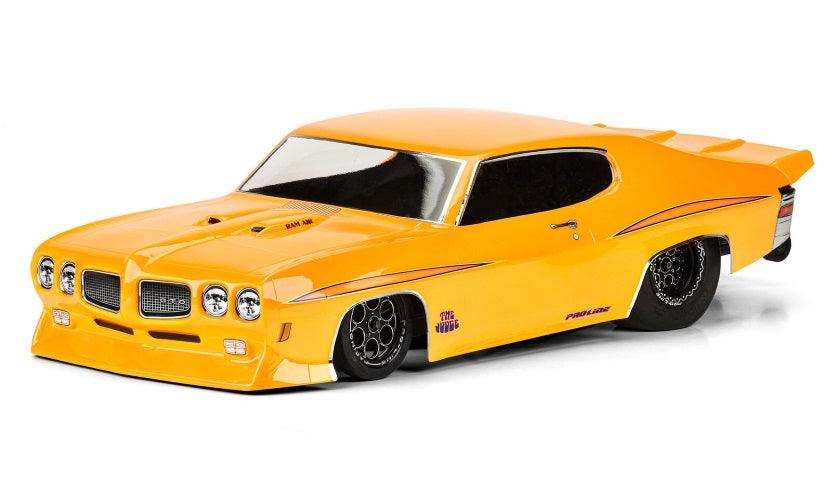 GTO fans, your time has come! Pro-Line is proud to introduce the iconic 1970 Pontiac GTO clear body to the no-prep drag racing scene. The front end features the split front grill and dual headlights per side just like the full-size muscle car and the scale undercut detail under the front nose is only made possible with Pro-Line's proprietary molding technology. This GTO body has been faithfully recreated in 1/10 scale size and tuned specifically for drag racing. The body comes clear giving you the option to paint the body however you desire. Pro-Line even includes a drag-style rear wing to keep you going straight down the track. If you are a Pontiac GTO fan, then this is a must-have body for your drag car. Get your own 1970 GTO Judge body today!